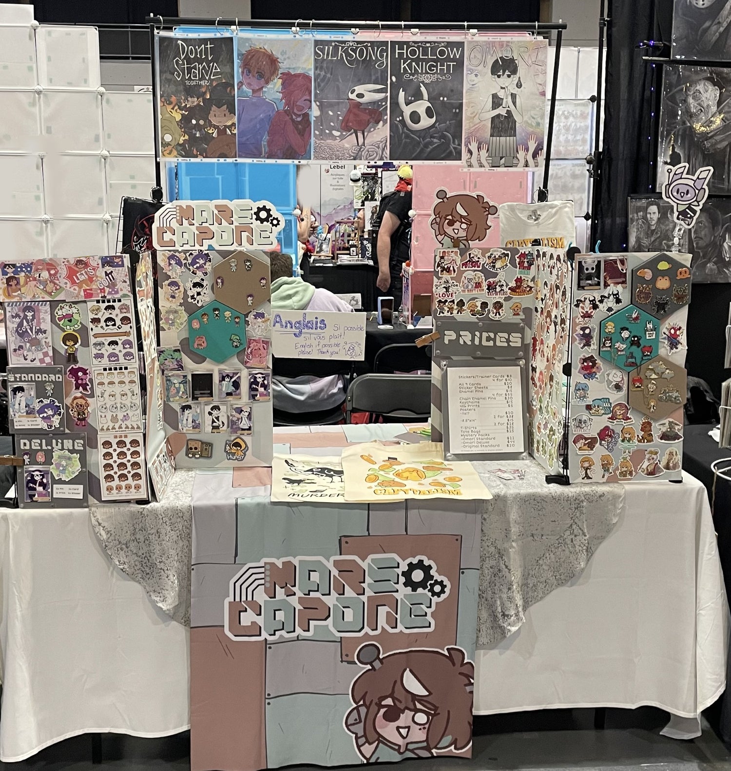 Here are some samples of my past tables as well as merchandise that I bring with me to conventions. I sell enamel pins, stickers, prints, lanyards, clay charms and magnets, and soon acrylic keychains. This page shows a small sample of each genre, feel free to browse my website to view all of my products.