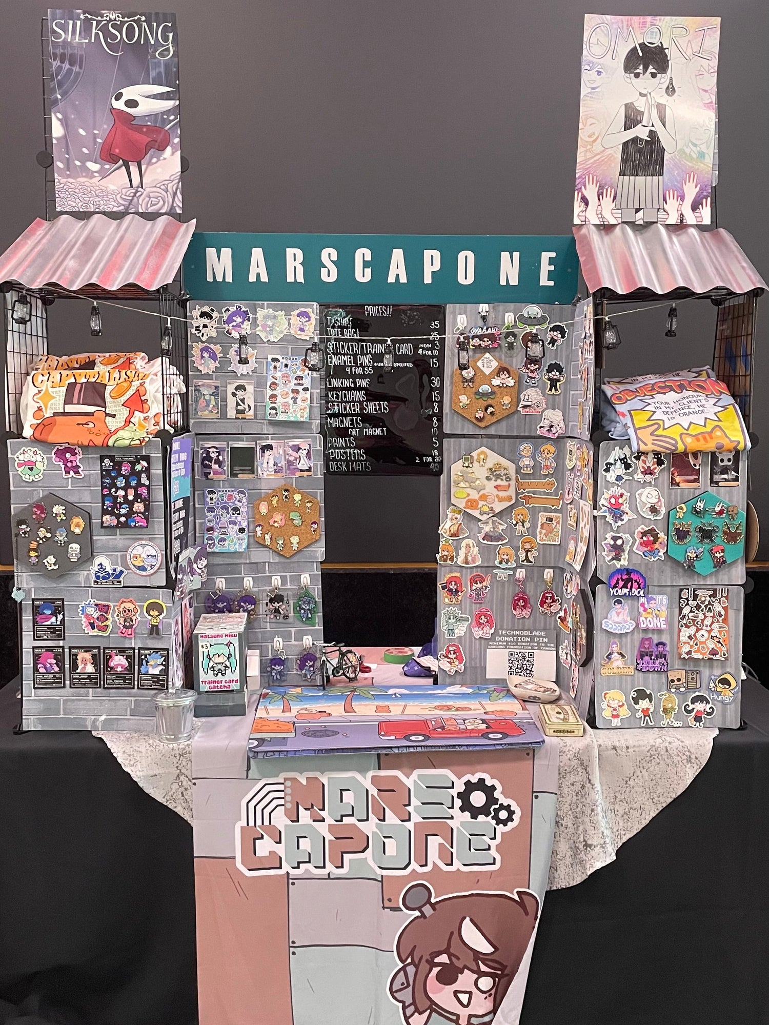 Here are some samples of my past tables, as well as merchandise that I bring with me to conventions. I sell enamel pins, stickers, prints, lanyards, keychains, patches, T-shirts, and more. This page shows a small sample of each genre. Feel free to browse my website to view all of my products.