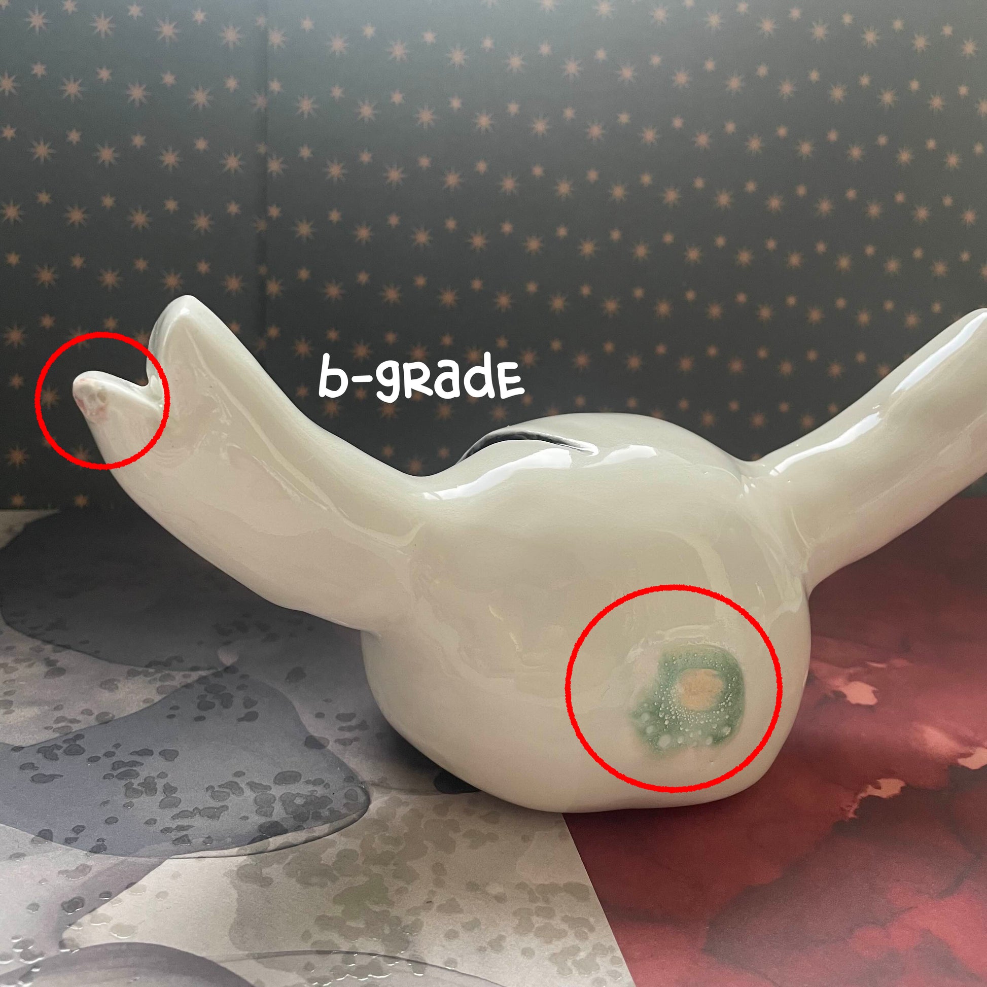 One B-Grade Mask is available! This piece got stuck to someone else's piece in the kiln and now has a green spot on both the horn and the backside.